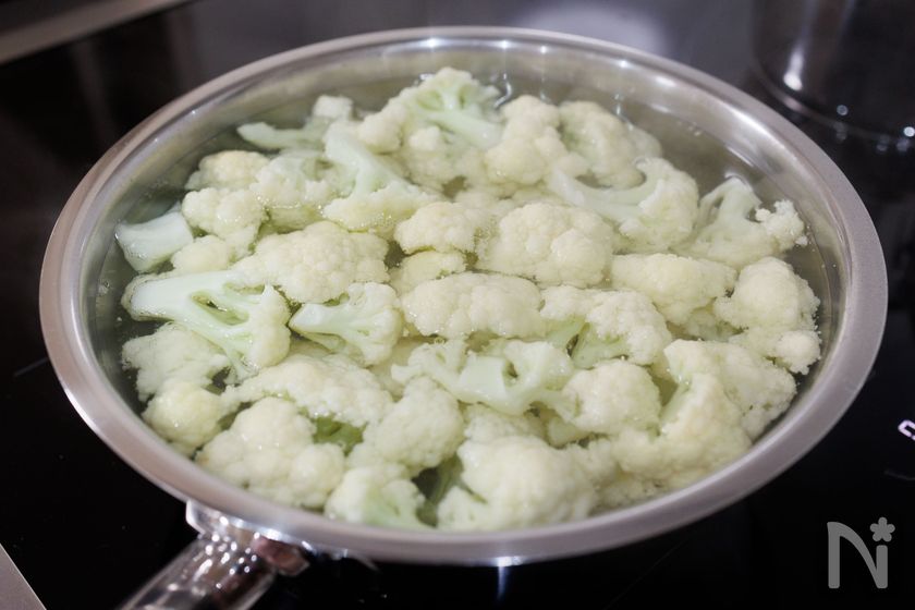 (1) カリフラワーは小房に切り分ける。熱湯(1L)に塩(小さじ2・分量外)を溶かし、カリフラワーを2分茹でて水気を切り、粗熱を取る。