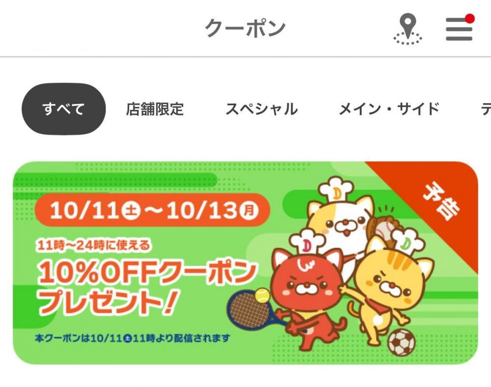 公式アプリの「クーポン」タブ内で、10月11日から13日まで(各日11時から24時)の期間で使える10%オフクーポンの配布を予告。