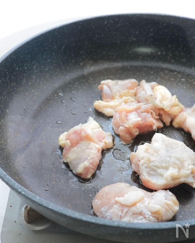 鶏もも肉は1口大にカットし、塩こしょうを振っておく。