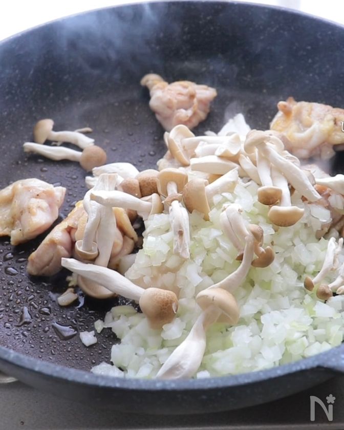 (2) こんがりとした焼き色が付けば、玉ねぎとしめじを加えてしんなりと全体がなじむまで炒める。