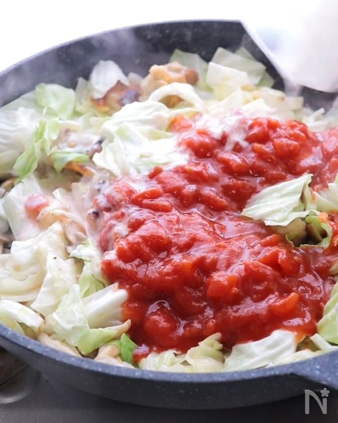 (3) キャベツと【A】を加え、全体を混ぜ合わせる。