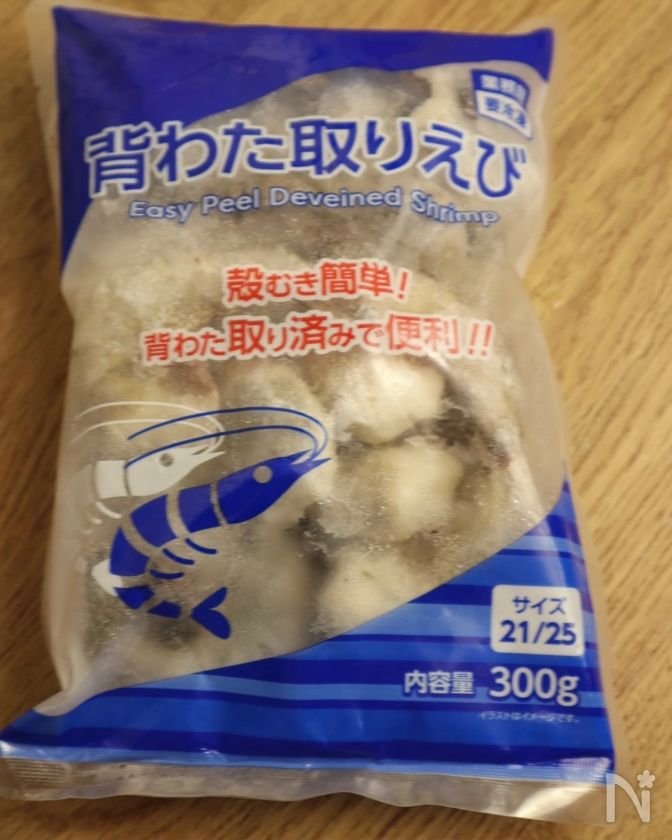 (5) 業務スーパーの背わた取りえび(21/25)を使用しました。背わたの処理がすでに済んでいるため、下処理の手間が少なく、忙しい日のごはん作りにも取り入れやすい商品です。殻付きではありますが、背中に切り込みが入っているので殻むきがしやすく、調理前のストレスがぐっと減ります。サイズは21/25とやや大きめで、1尾1尾にしっかり存在感があります。