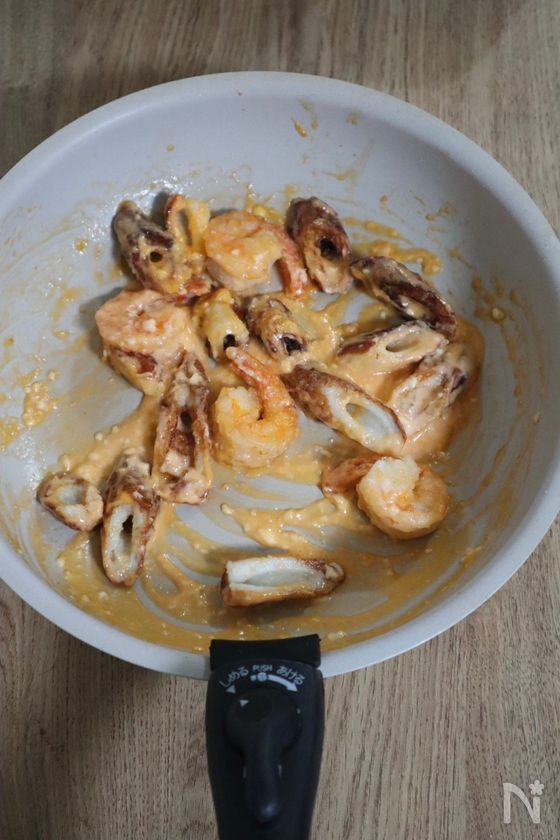 (3) フライパンの油を取り除き、混ぜ合わせた【A】を入れ、煮立ったら火を止めて背わた取りえびとちくわを入れて全体に味がなじむように絡める。