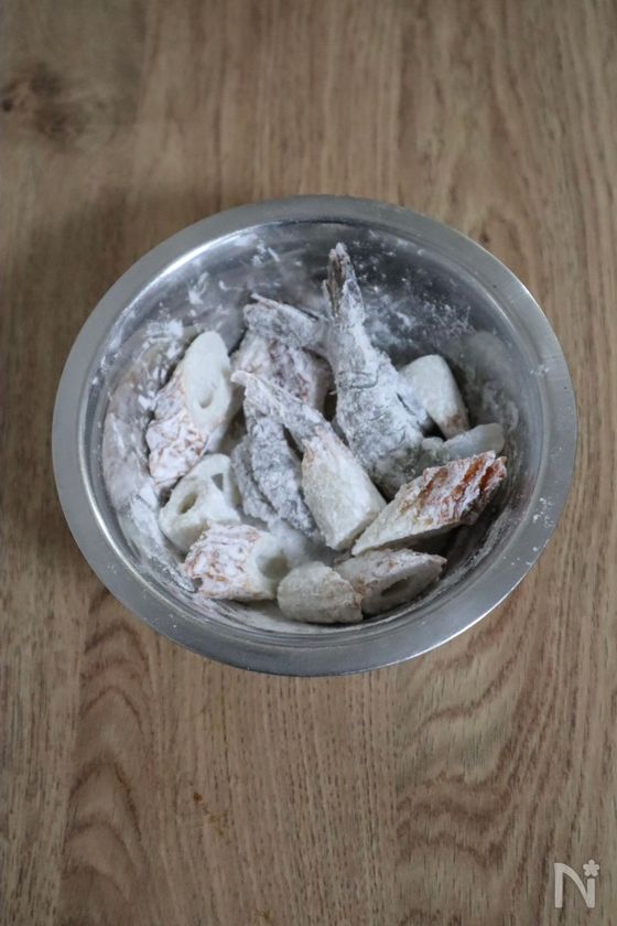(1) 半解凍にした背わた取りえびは、殻をむき、余分な水分を拭き取っておく。ちくわは斜めに薄切りにし、それぞれに片栗粉をまぶす。