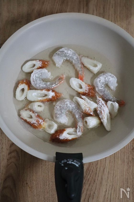 (2) 中火で熱したフライパンにサラダ油を高さ5mm程度入れ、背わた取りえびとちくわを1〜2分程度揚げ焼きにし、油を切る。