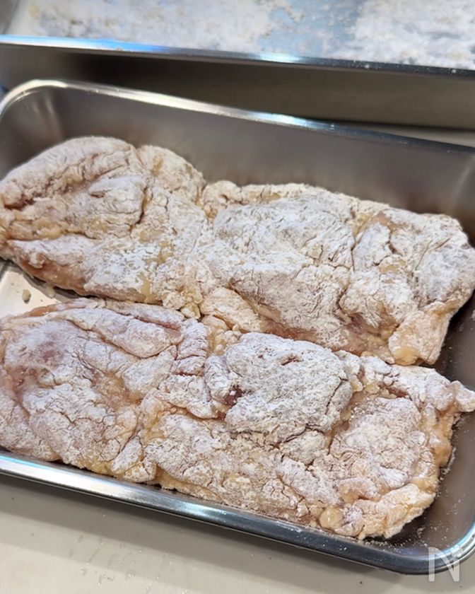 (4) 【D】をよく混ぜ、漬け置いていた鶏にしっかり衣をつけ、ラップをせずそのまま5分置いておく。さらにもう一度衣をつけて揚げる。