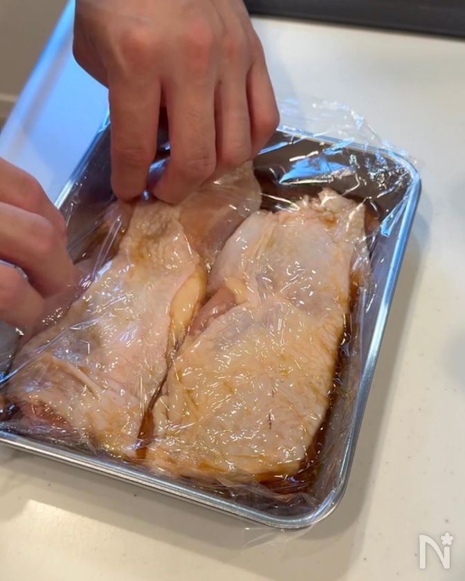 鶏もも肉を手前にスネ、奥にももになるように置き、縦半分に切る。鶏をバットに入れ、【A】とすりおろした生姜の1/3を入れて揉み込み、身側を下にして落としラップをして10分おいて置く。