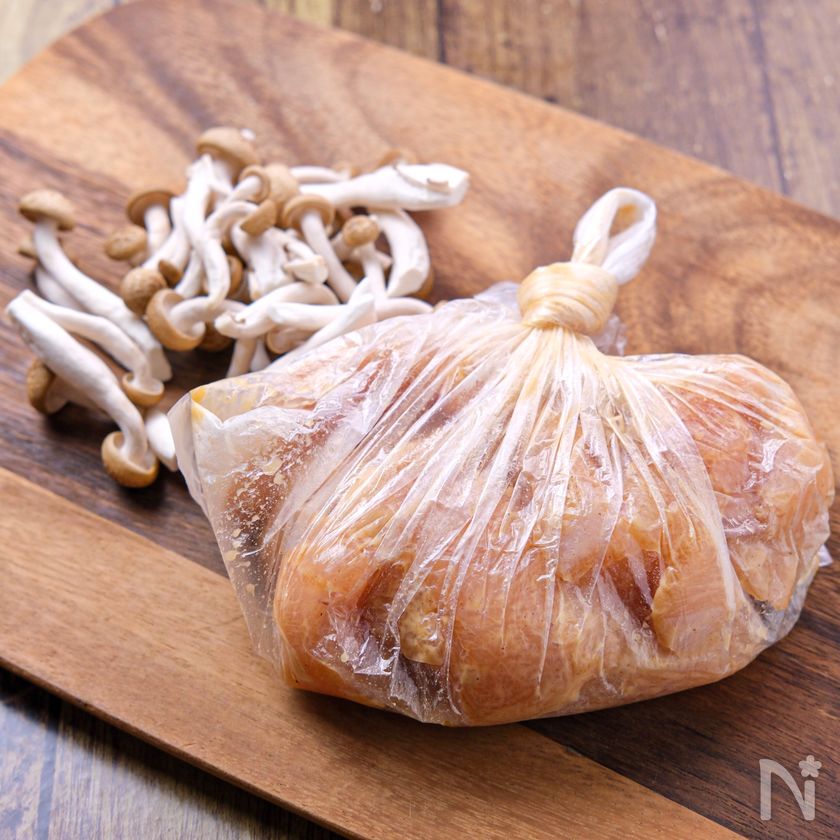 鶏むね肉は縦半分に切って一口大の削ぎ切りにし、ポリ袋に加える。