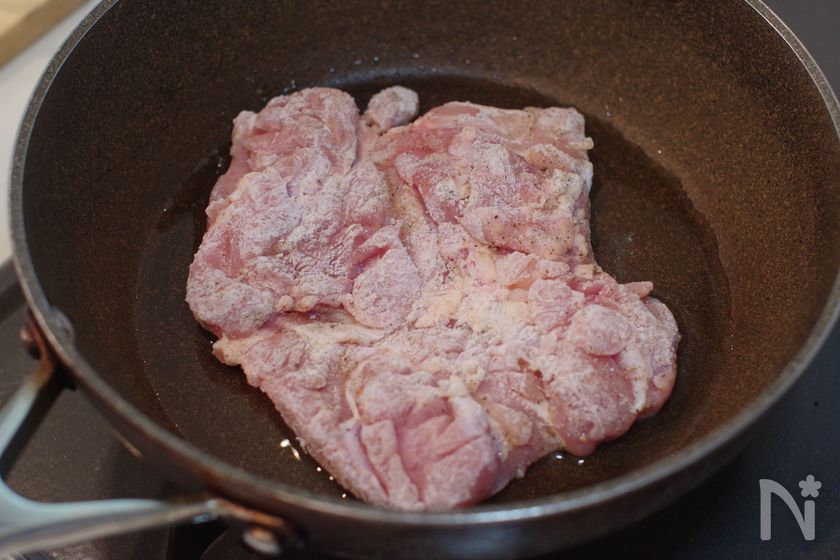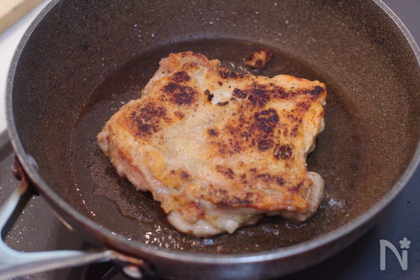 (2) フライパンに油をひき、中火で熱し皮目を下にして蓋をして4分焼く。