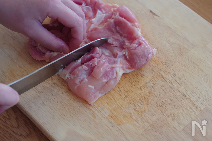 (1) 鶏もも肉は余分な油を切り取り、身の厚い部分は包丁で切り込みを入れる。両面に塩・胡椒をして、片栗粉を薄くまぶす。