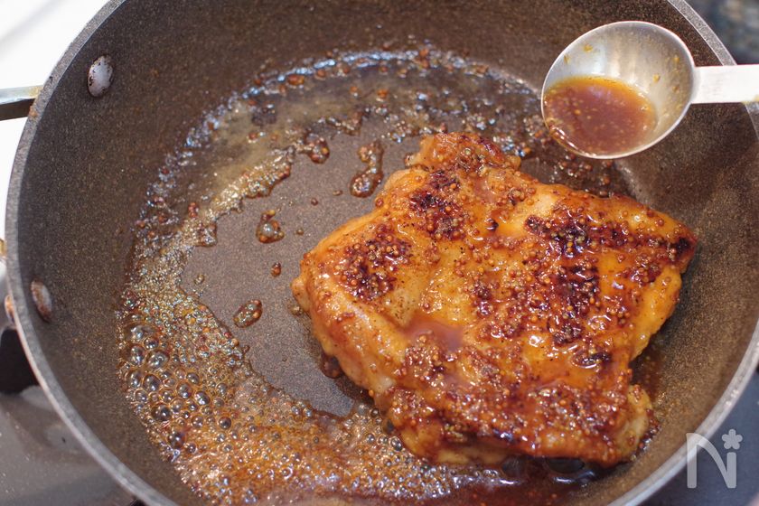 (4) 両面焼けたら合わせた【A】を加え弱火ににして、鶏肉にかけながら煮からめる。とろみがついたら火を止める。2分ほど置いてから切る。
