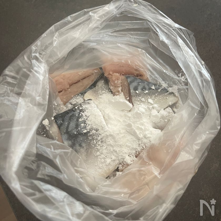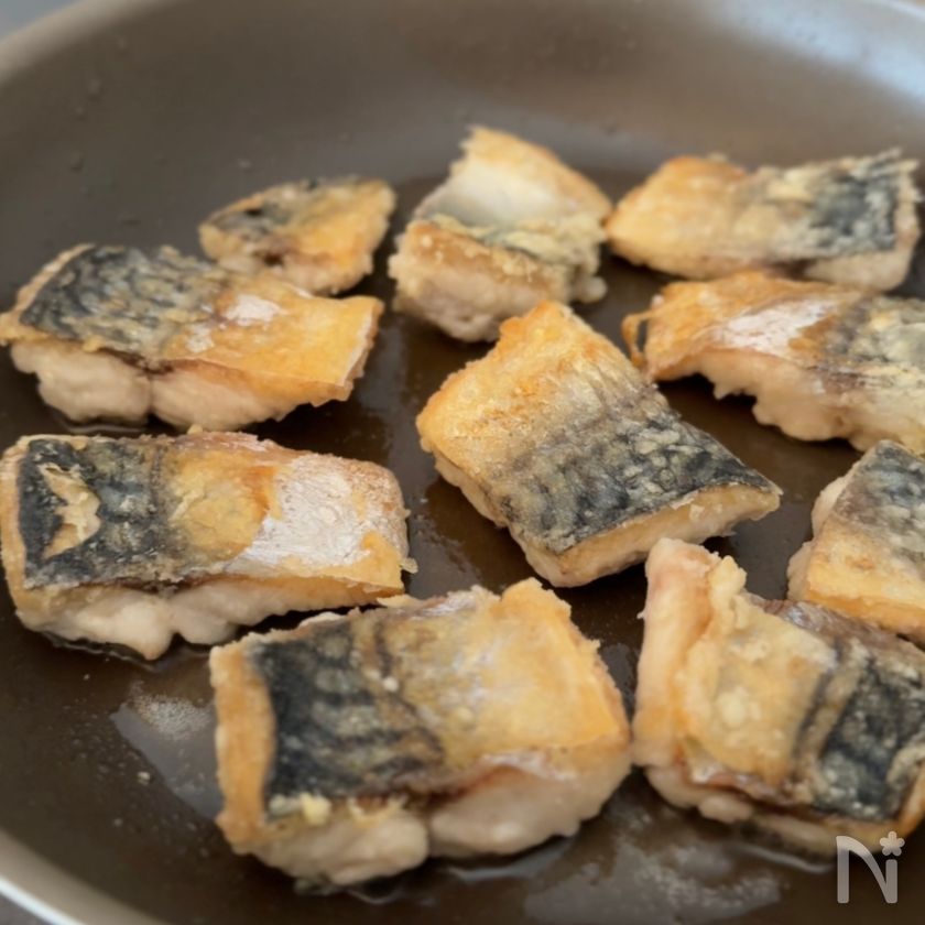(1) 無塩サバの水分を拭き取ってから2cm幅に切り、塩と片栗粉をまぶす。