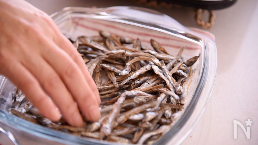 (1) ごまめは600ワットの電子レンジで1分チンして混ぜます。