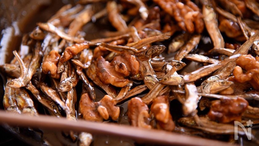 ごまめはレンジで空煎りすると、簡単にポキッとします。くるみは素焼きにする。皮にポリフェノールがたくさん含まれているので今回はそのまま入れています。甘辛で渋みがごまかされるし、栄養だからそのままいただきます♬