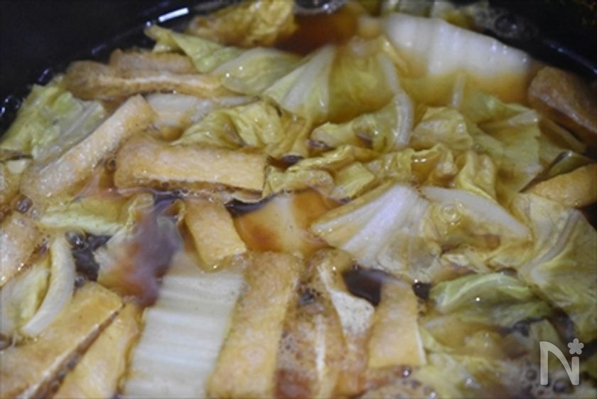 (1) 油揚げは短冊切りに、白菜は根元は細切り葉先はざく切りにする。