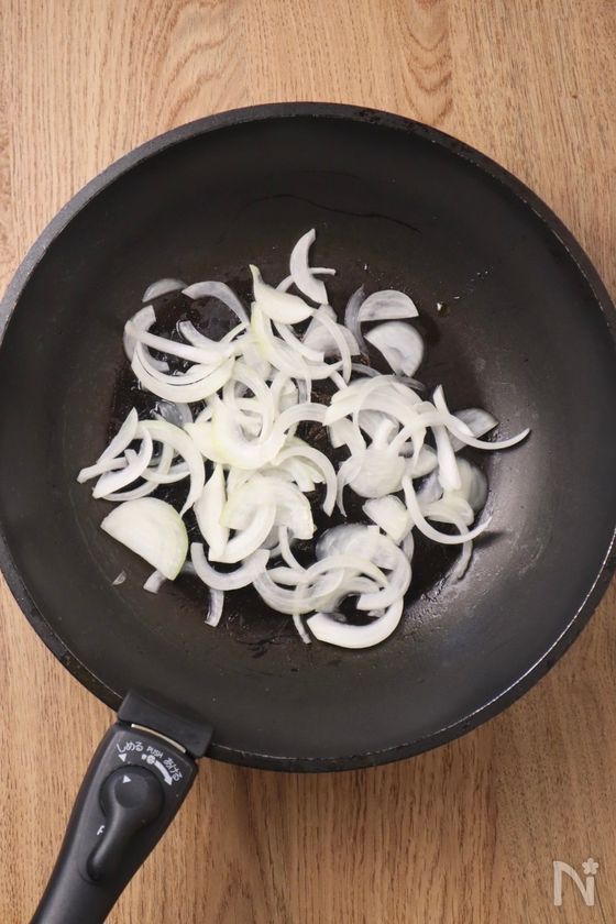 (1) 中火で熱したフライパンに薄切りにした玉ねぎを入れてしんなりするまで炒める。