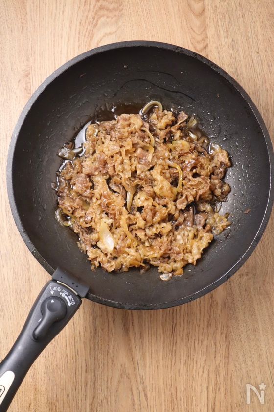 牛肉は加熱しすぎると硬くなりやすいので、色が8割ほど変わった時点で【A】を加えるのがコツです。やわらかさを保ったまま、たれの味がよくしみ込みます。