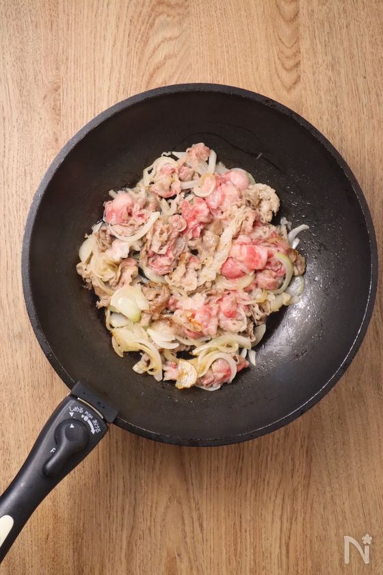 (2) 牛薄切り肉を入れ、色が変わり始める程度(8割)まで炒める。