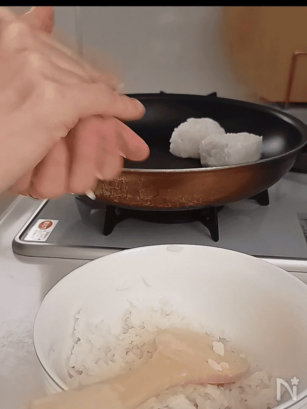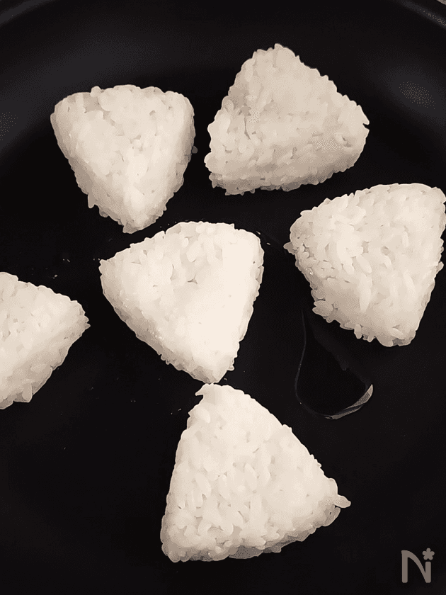 (2) フライパンにごま油をひき、おにぎりを並べ弱めの中火にかける。