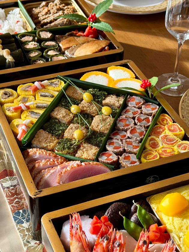表面に青のりと粉チーズをふり、市松模様に仕上げるとよいでしょう。