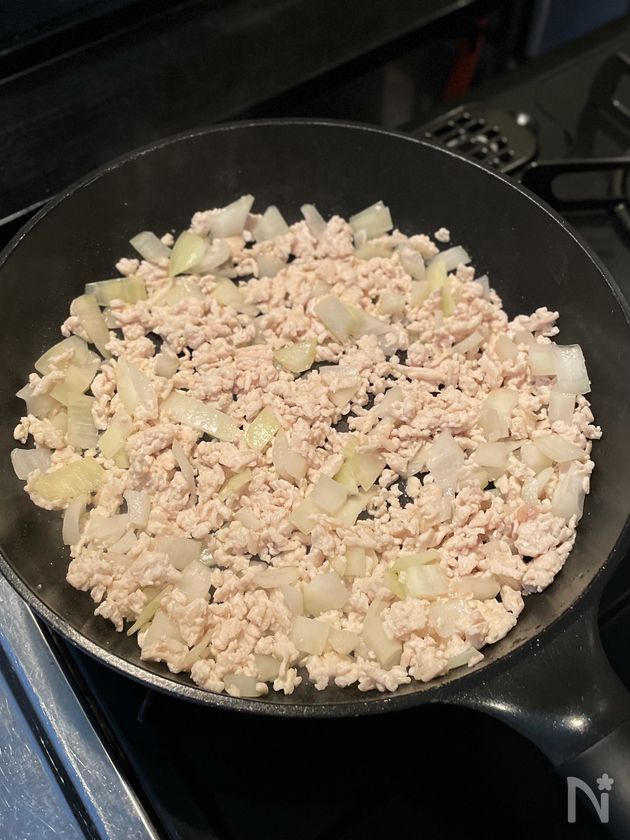 (2) ごま油を中火で熱し、鶏ひき肉、塩こしょうを加えて炒める。お肉の色が変わったら、玉ねぎも加えてしんなりするまで炒める。