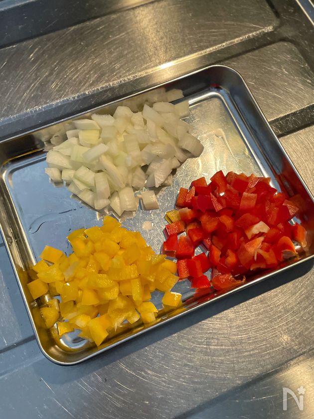 (1) 玉ねぎ、黄パプリカ、赤パプリカは1cm角に切る。