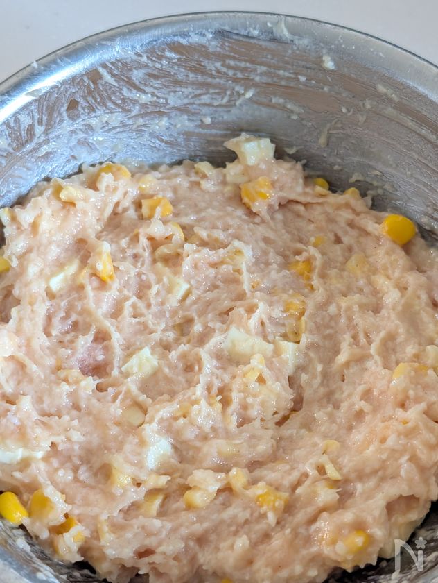 ・1のパン粉牛乳に、鶏ひき肉、チーズ、コーン、溶き卵、【A】を入れて、下からしっかり混ぜる。