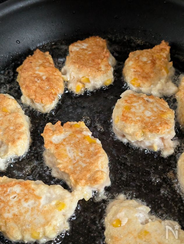 (3) 2の肉だねをスプーンを塗らせながらすくって入れ、揚げ焼きする。(両面きつね色になるまで、約5~6分)