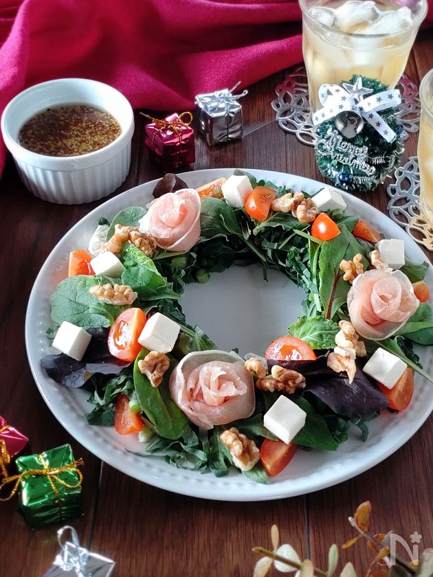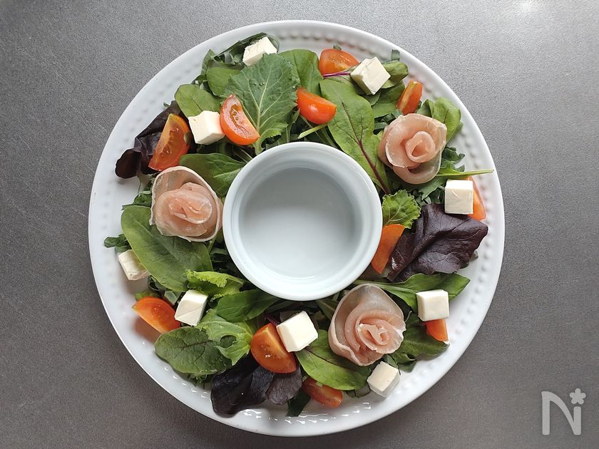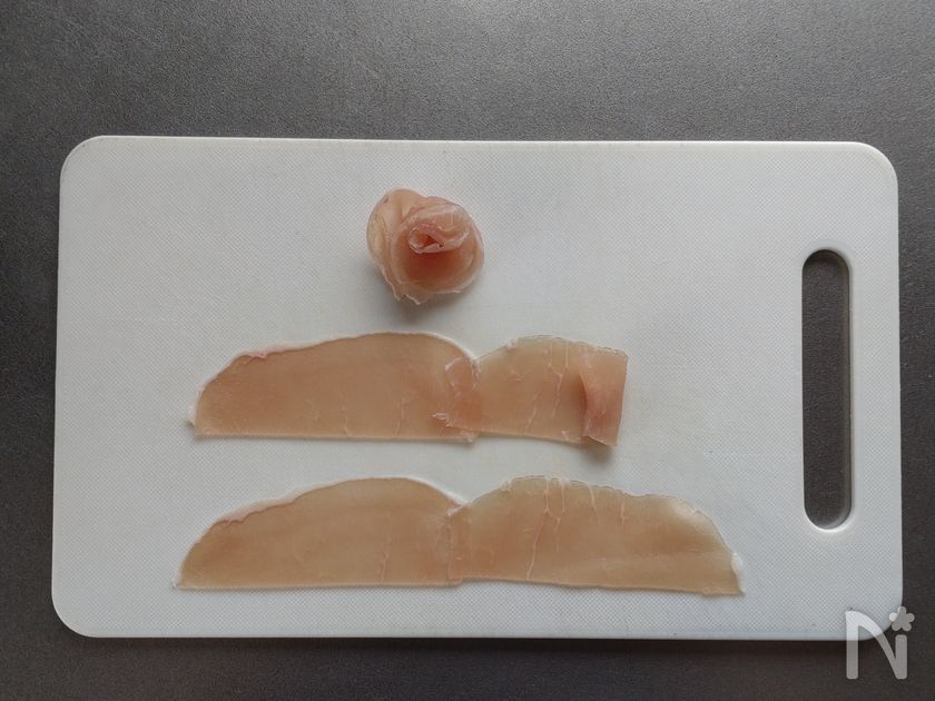 (1) 生ハムは横半分に切り、少し重ねて端から巻いて軽く開き、薔薇の形にする。