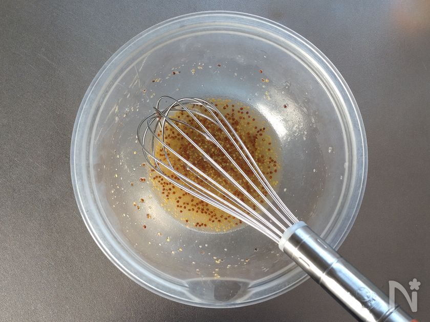 (7) 【A】をボウルに入れ、泡立て器で30秒ほどしっかり混ぜる。(ハニーマスタードドレッシング)