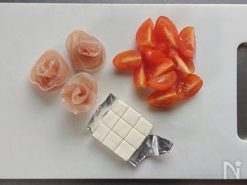 (2) ミニトマトは4等分に、クリームチーズはサイコロ状に切る。