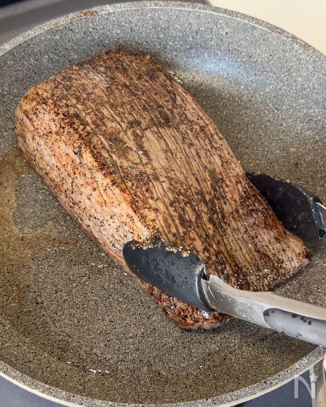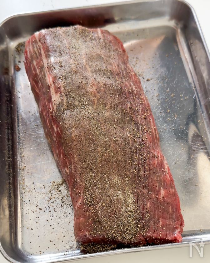 (1) 牛もも肉ブロックは塩、こしょうを全体に振ってすり込んだらそのまま常温で30分ほどおく。