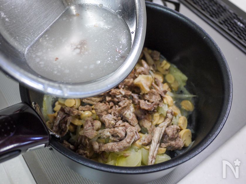 (3) 牛すじ肉、水と牛すじ肉煮汁を入れてひと煮立ちさせます