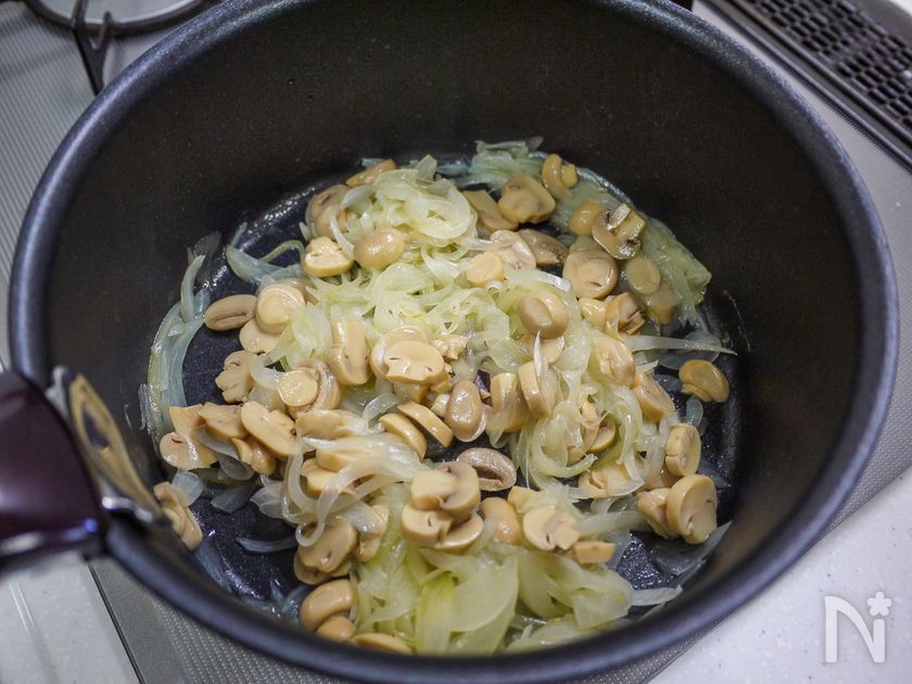 中火でしんなりするまで炒めマッシュルームを加えます