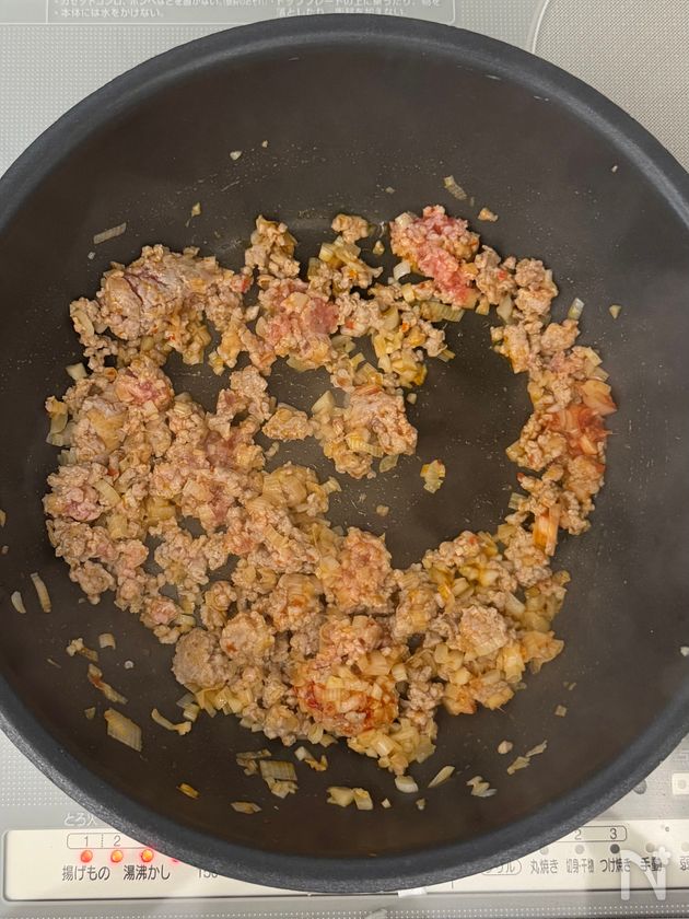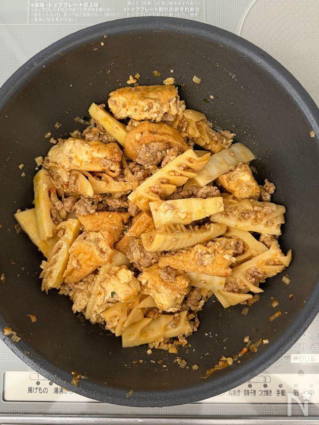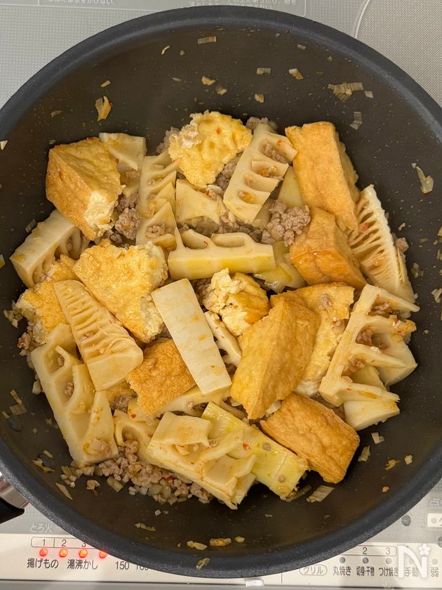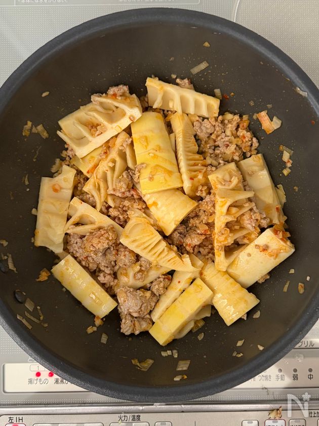 (2) ひき肉に大体火が通ったら、たこのこを入れ、たけのこが温まるまで炒める。