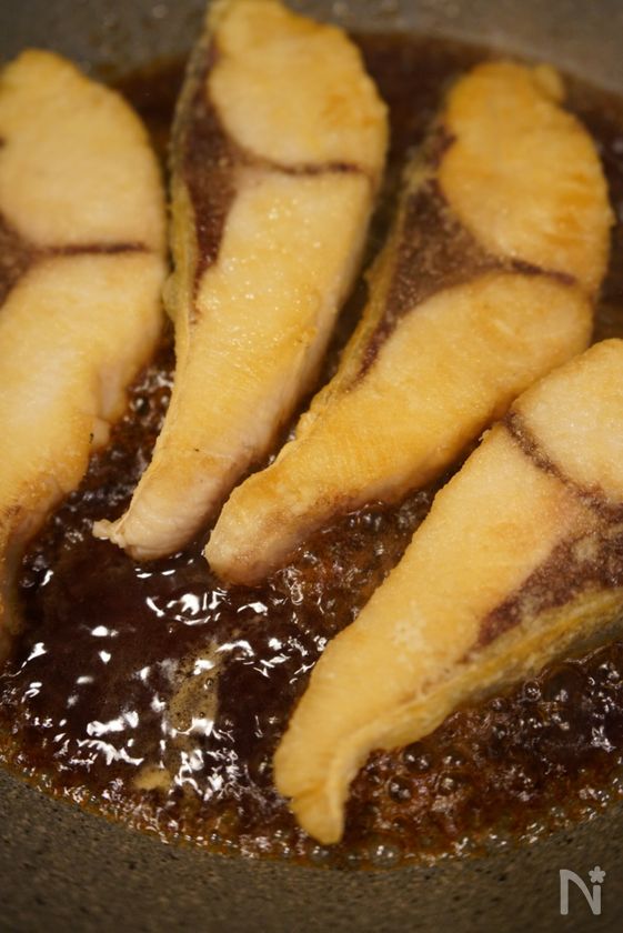 (1) 鰤に片栗粉を付ける。