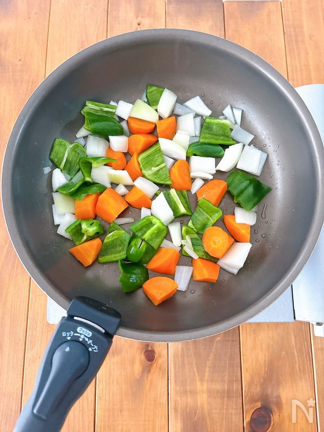 (3) サラダ油を火にかけ、野菜を加えて炒める。