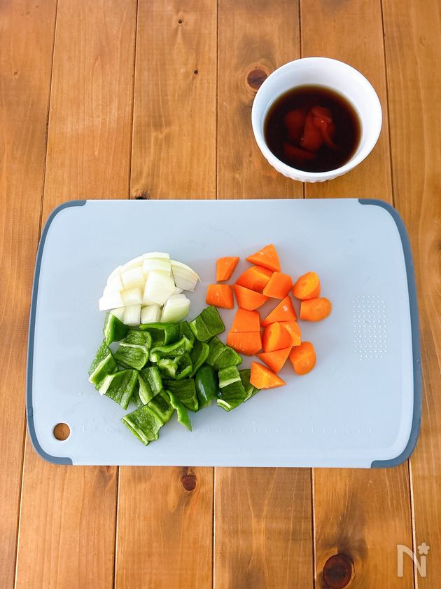 玉ねぎはひと口大に切る。ピーマンは乱切り。