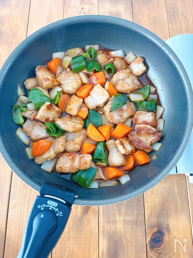 (5) 野菜を戻し入れてBを加えてとろみが付くまでしっかりと炒め合わせる。