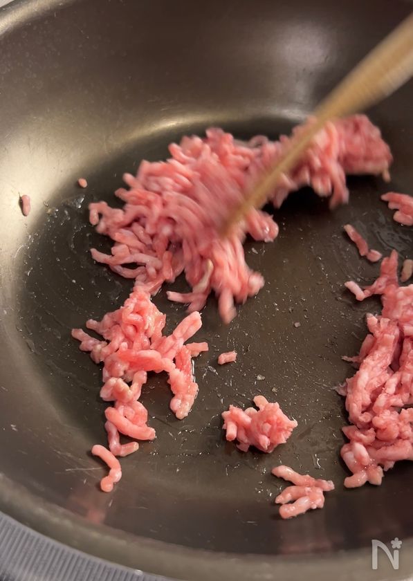 (1) フライパンに豚ひき肉を入れて、中火にかける。