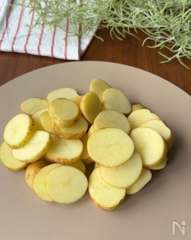 (下準備) 新じゃがはよく洗い、1cm幅に切る。