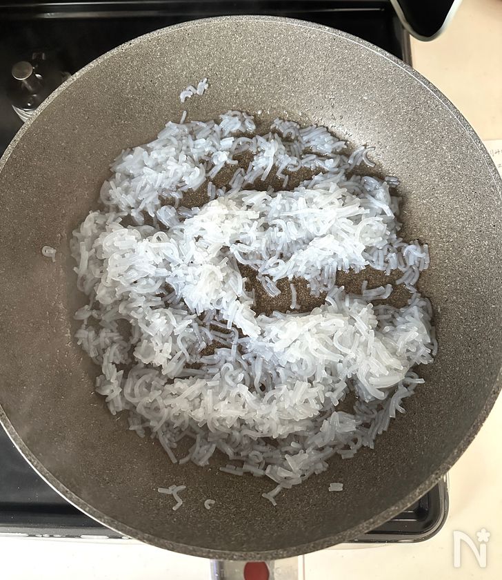 (2) フライパンにごま油を中火で熱し、しらたきの水気がなくなるまで炒める。