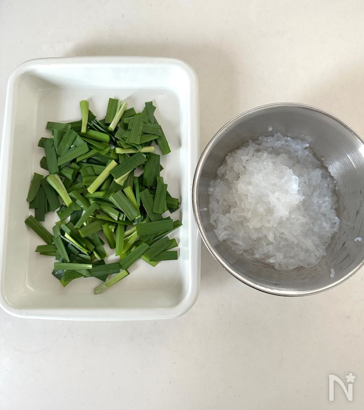 (1) しらたきは粗みじん切り、にらは5cm幅に切る。