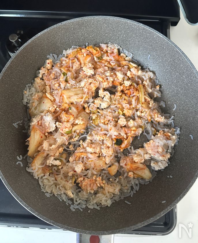 (3) 鶏ひき肉、白菜キムチを加えさらに炒め、鶏ひき肉に火が通ってきたらにらを加えさっと炒める。