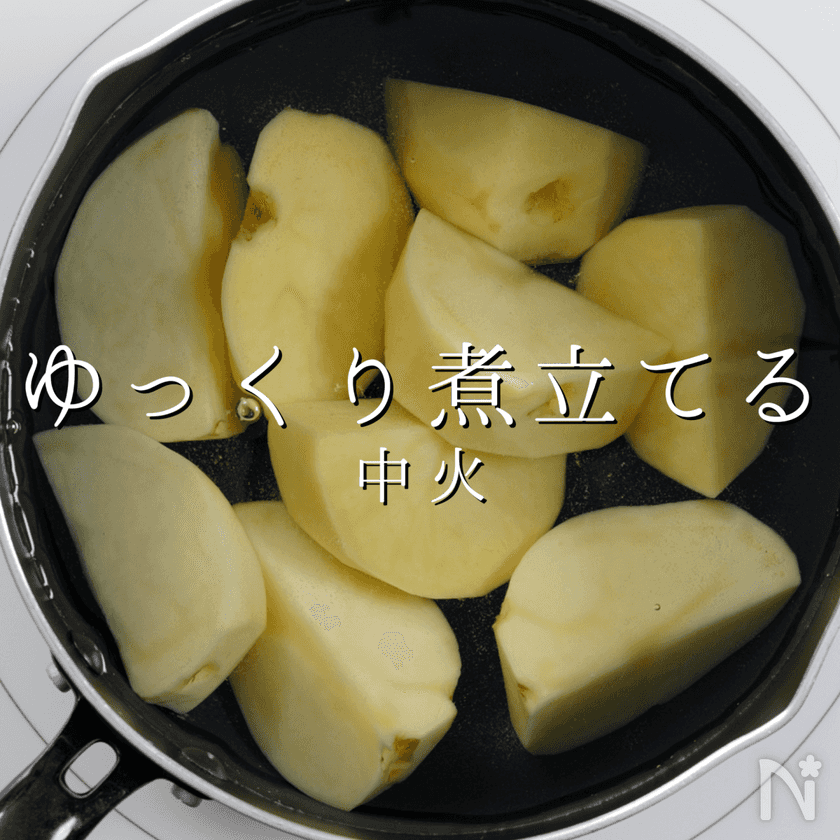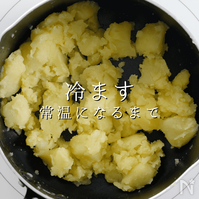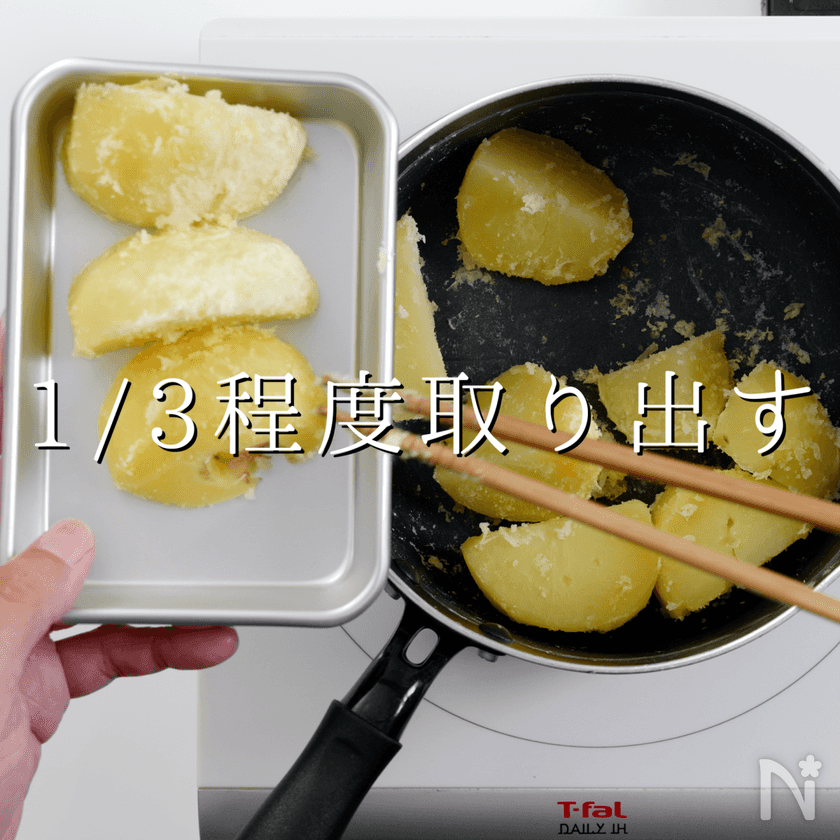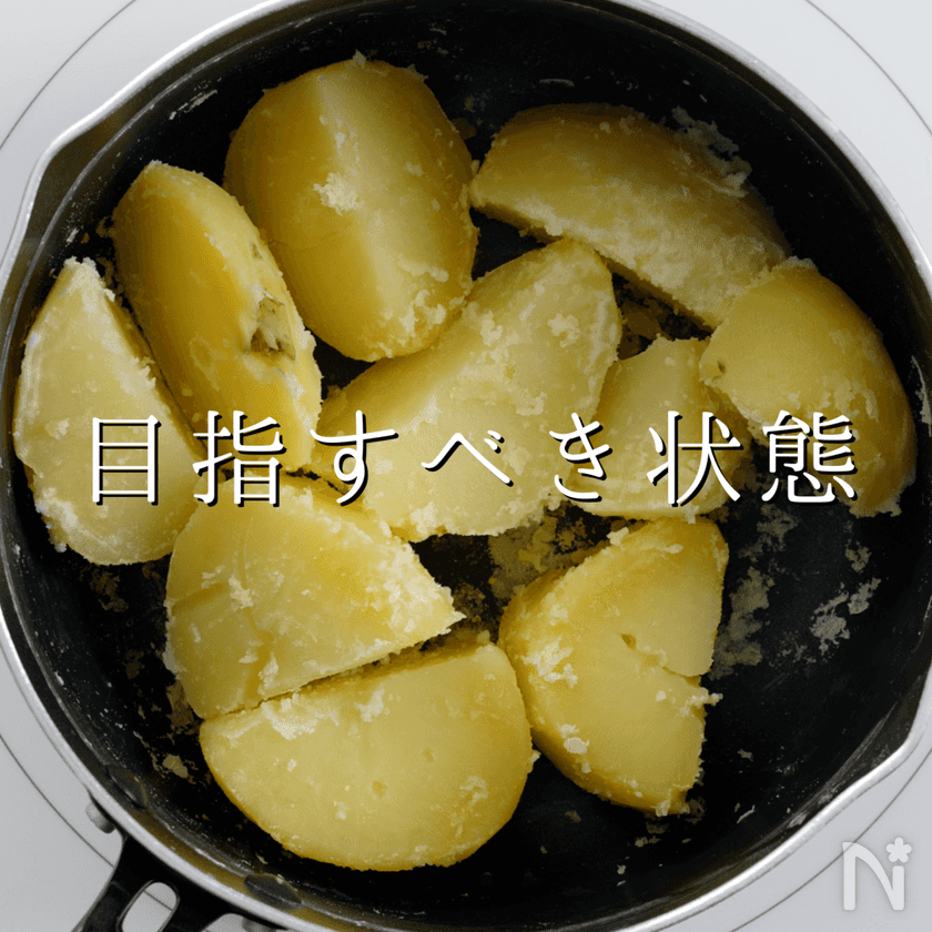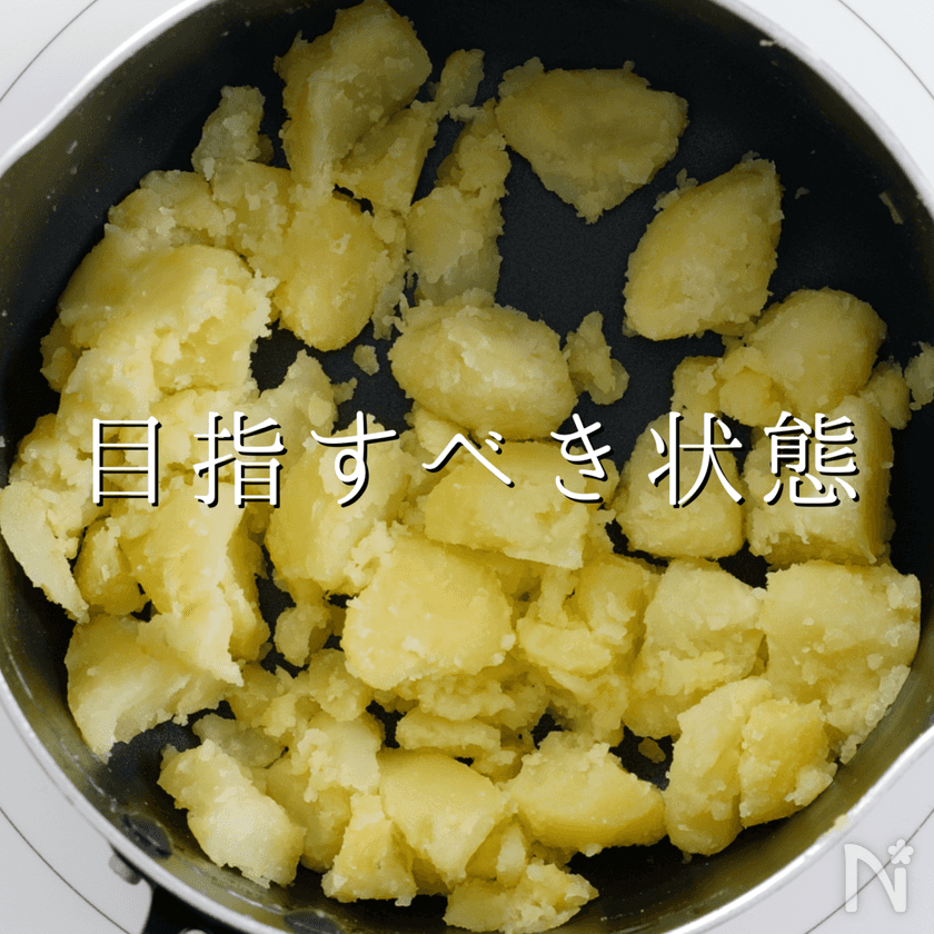 いわゆる粉ふき芋状態にします。ただ、焼き色がつきやすいので、ごく弱火で。