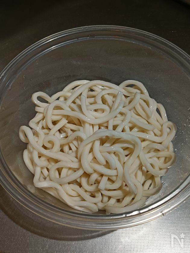 (3) うどん(ゆで)を耐熱容器に入れ、水で洗う。水気を切り、塩を加えて混ぜる。ふんわりとラップをし、電子レンジ600Wで2分加熱する。