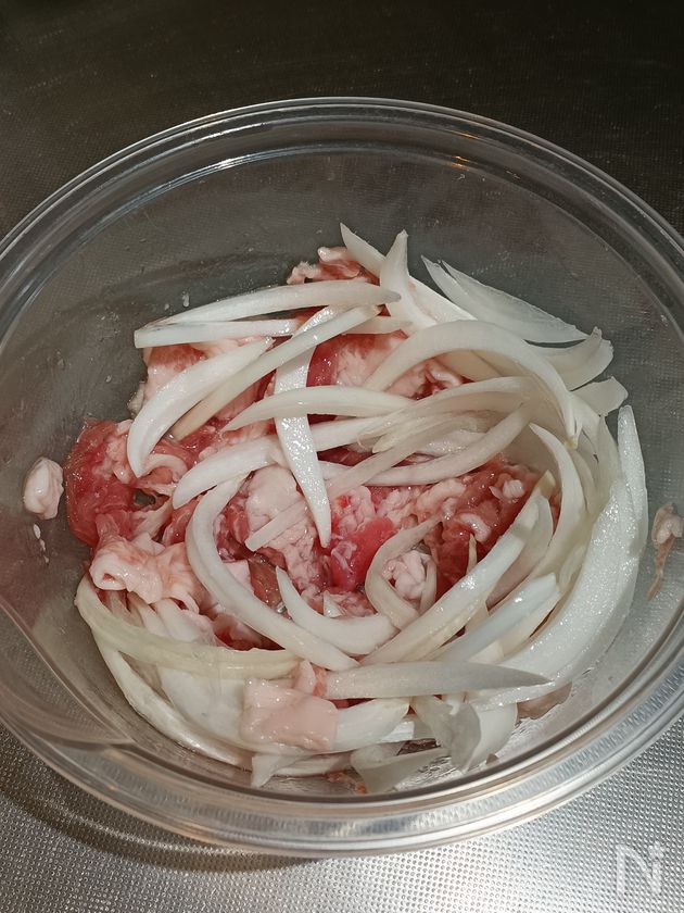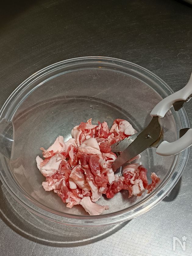 (1) 豚こま肉は耐熱容器に入れ、キッチンバサミで食べやすい大きさに切る。【A】を加えて揉み込む。
