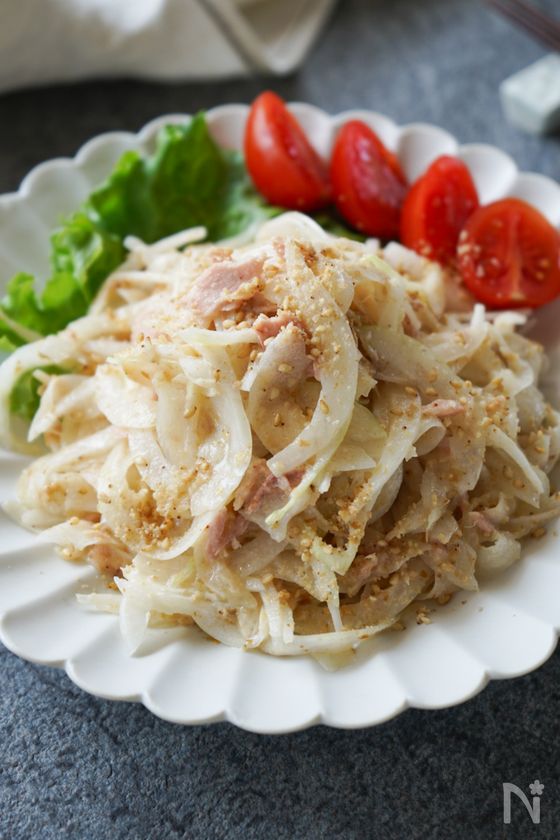 (2) 新玉ねぎはくし形に切り、1と混ぜ合わせる。ふんわりとラップをし、電子レンジ600Wで3分加熱する。加熱後、醤油を加えてひと混ぜし、再び電子レンジ600Wで1分加熱する。