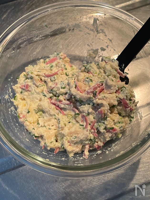(2) ボウルに絹豆腐を入れ、泡立て器で滑らかになるまで混ぜる。ハムをハサミで細切りにして加え、【A】も加えて混ぜ合わせる。