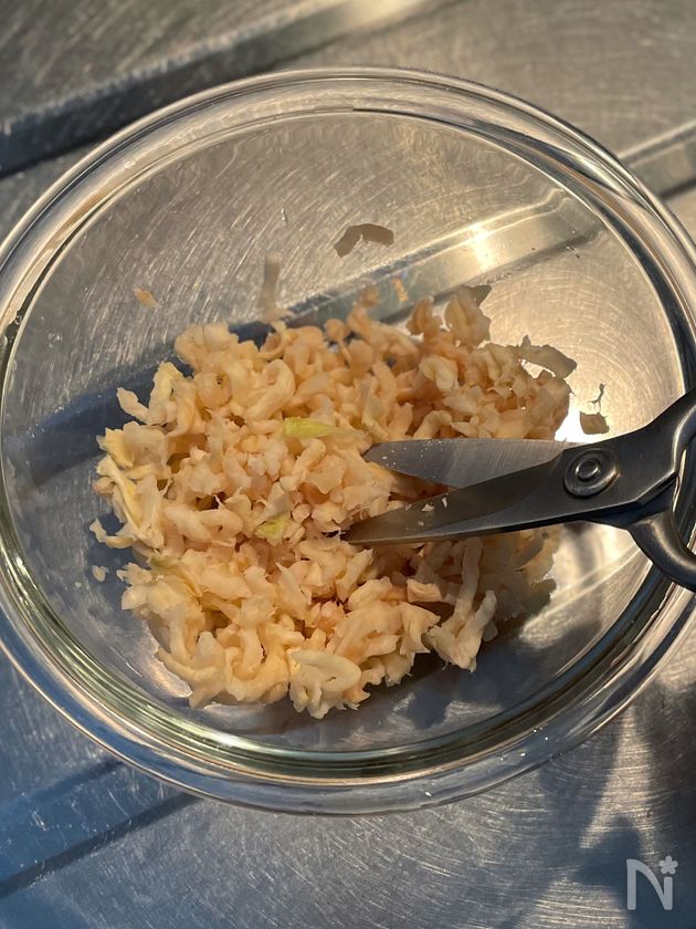 (1) 切り干し大根はたっぷりの水に浸して戻し、水気を絞ってハサミで短く切る。